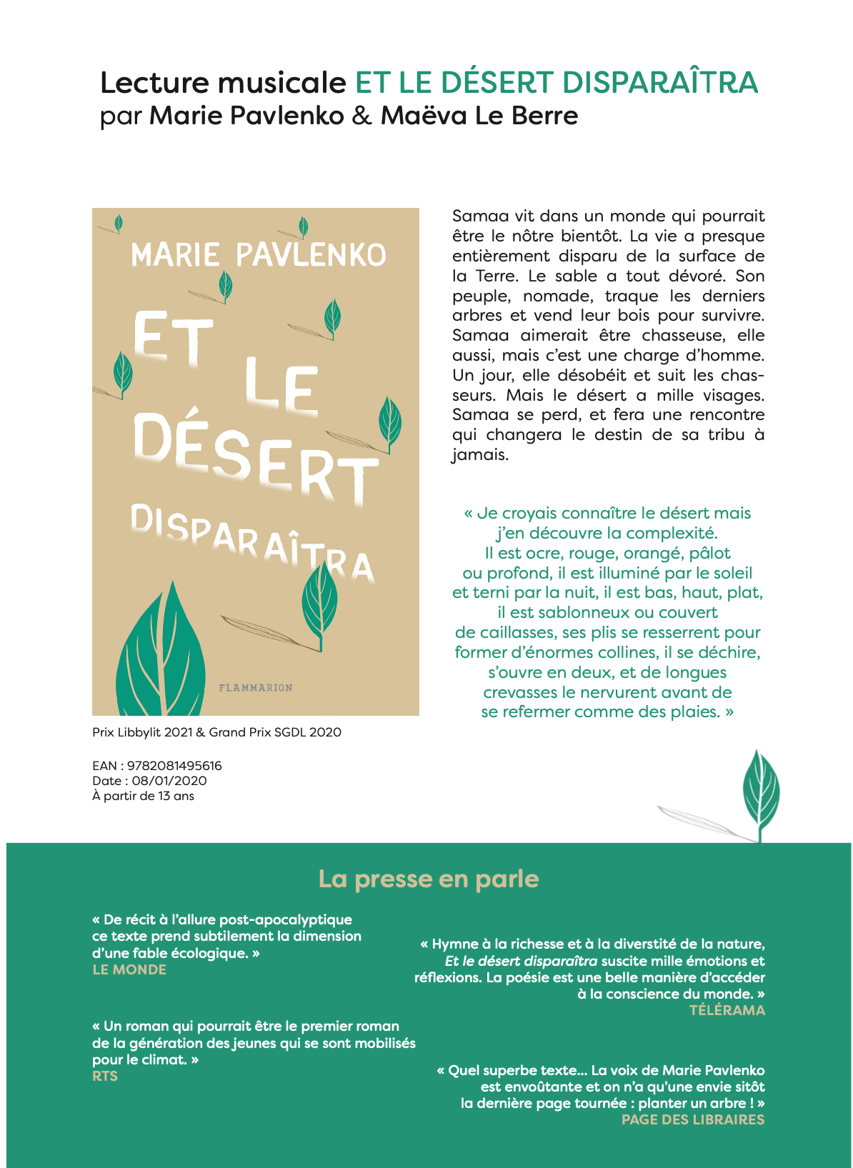« Avec des mots très simples, des images d’une grande puissance évocatrice, Marie Pavlenko a créé une voix limpide, à la fois proche et à distance. Une voix venue de loin, d’un futur qui résonne avec nos inquiétudes d’aujourd’hui. Samaa n’appartient pas à un monde de science-fiction. Son aventure, l’évolution de son regard, son combat à rebours des idées dominantes de sa tribu nous concernent directement. Hymne à la richesse et à la diversité de la nature, Et le désert disparaîtra suscite mille émotions et réflexions. La poésie est une belle manière d’accéder à la conscience du monde. »