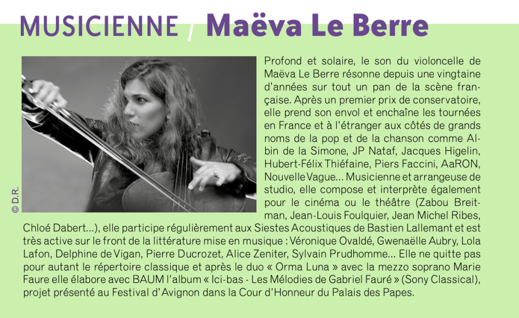 J’ai créé trois lectures musicales avec la merveilleuse violoncelliste Maëva Le Berre, qui joue, chante, et a composé pour l’occasion des musiques originales.